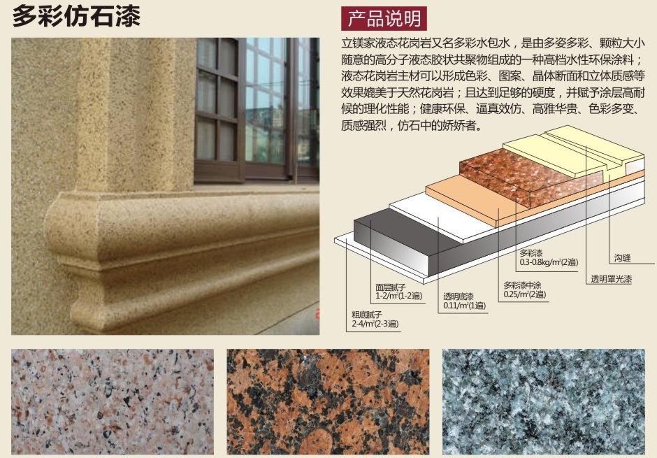 水包水多彩漆可以达到天然花岗岩的逼真效果,打造出建筑庄重典雅的装饰气息,节约天然资源。